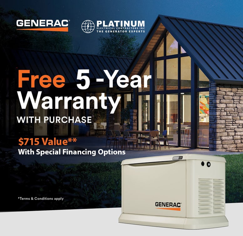 Fill out our free quote form to claim an exclusive offer of $790 in 5-year extended warranty on your new Generac generator—plus enjoy a complimentary consultation with our experts. Get prepared for the unexpected with Platinum!